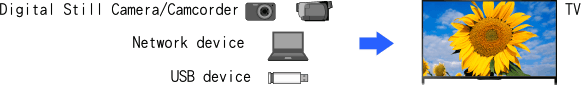 A photo with 4K or higher resolution can be displayed in 4K resolution (3840×2160). You can connect a digital still camera/camcorder that supports HDMI 4K output to HDMI 輸入 of the TV to display high resolution photos stored on the camera. You can also display high resolution photos stored in connected USB devices or your home network.
