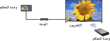بتمكين وظيفة جهاز العرض، يمكنك تشغيل ملفات الفيديو/الموسيقى/الصور في وحدة تحكم (مثل كاميرا رقمية ثابتة) على شاشة التلفزيون عن طريق تشغيل الجهاز مباشرة. كما يمكن أن يعمل جهاز محمول (مثال، هاتف ذكي) كوحدة تحكم عن بُعد خاصة بالتلفزيون عبر الشبكة المنزلية.