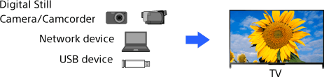 A photo with 4K or higher resolution can be displayed in 4K resolution (3840×2160). You can connect a digital still camera/camcorder that supports HDMI 4K output to HDMI IN of the TV to display high resolution photos stored on the camera. You can also display high resolution photos stored in connected USB devices or your home network.