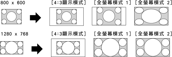 - 以原始尺寸顯示4:3畫面。16:9的螢幕會被邊條填滿。