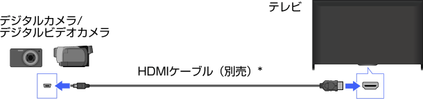 ソニー製デジタルカメラやデジタルビデオカメラなどをHDMIケーブルでつなぎます。デジタルカメラやデジタルビデオカメラ側がHDMIミニ端子、テレビ側がHDMI端子のHDMIケーブルをお使いください。