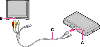 使用多用端子USB/AV/DC IN连接线(另售)(C)连接相机的多功能接头(A)和电视机上的音频/视频输入插孔(B)。