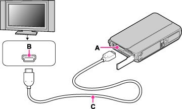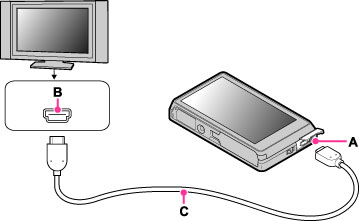 قم بتوصيل طرف التوصيل HDMI الموجود على الكاميرا (A) ومقبس HDMI الموجود على التلفزيون (B) باستعمال كبل HDMI (يباع بشكل منفصل) (C).