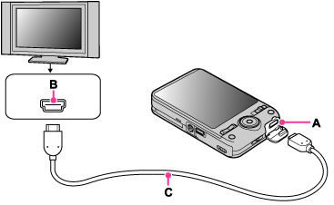 Conecte el conector HDMI de la cámara (A) y la toma HDMI del televisor (B) utilizando un cable HDMI (se vende por separado) (C).