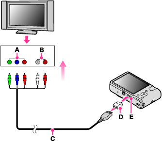 将转换适配器(D)安装到高清输出端子适配线(C)(另售)并用正确的电缆将相机连接到高清(HD)电视机。