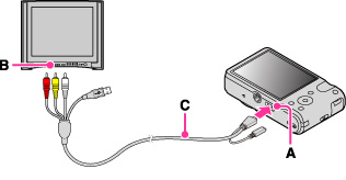 Conecte el conector múltiple de la cámara (A) y las tomas de entrada de audio/vídeo del televisor (B) utilizando un cable USB/AV/DC IN para terminal de usos múltiples (se vende por separado) (C).