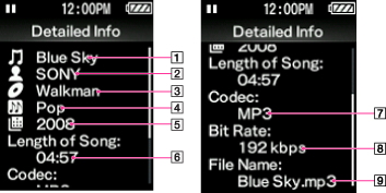 Displays detailed information of a song, such as playing time, audio format, bit rate, and file name [Details].