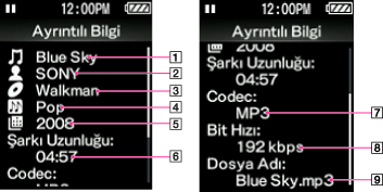 Bir şarkının çalma süresi, ses formatı, bit hızı ve dosya adı gibi ayrıntılı bilgileri görüntüler [Ayrıntılar].
