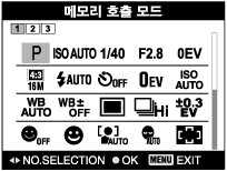(메모리 호출 모드)로 설정하면 등록된 설정이 우선적으로 적용되고 원래의 설정은 무효하게 됩니다. 촬영 전에 화면 상의 지시등을 확인하여 주십시오.