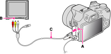 使用多用途USB/AV连接线(另售)(C)连接相机的多功能接头(A)和电视机上的音频/视频输入插孔(B)。