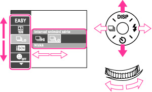 Rámeček výběru přesunete stisknutím horní/spodní/pravé/levé strany ovládacího tlačítka. V některých režimech lze přesunout rámeček výběru také otočením kolečka jog dial.