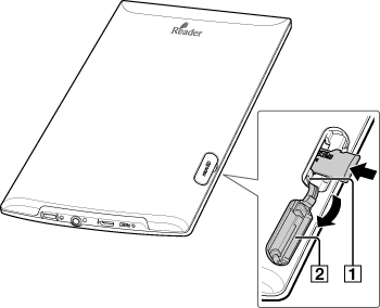 Ett microSD-kortuttag sitter placerat på nedre högra sidan på baksidan av Reader. Håll microSD-kortet med kontakterna vända nedåt och pilen riktad mot microSD-kortuttaget och för in det så att det klickar på plats. Åtkomstindikeringen lyser orange medan Reader har åtkomst till microSD-kortet.