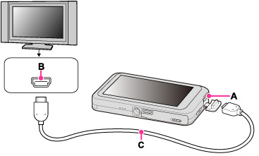 Connect the HDMI connector of the camera (A) and the HDMI jack of the TV (B) using an HDMI Cable (sold separately) (C).