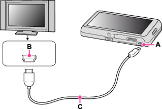 Conecte el conector HDMI de la cámara (A) y la toma HDMI (B) utilizando un cable HDMI (se vende por separado) (C).