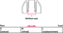 Kuulokkeisiin on kiinnitetty M-kokoiset nappikuulokkeet ennen toimitusta. Jos M-kokoiset nappikuulokkeet eivät sovi korviisi, vaihda ne S- tai L-kokoisiin nappikuulokkeisiin (vakiovaruste). Tarkista nappikuulokkeiden koko niiden sisään merkitystä väristä.