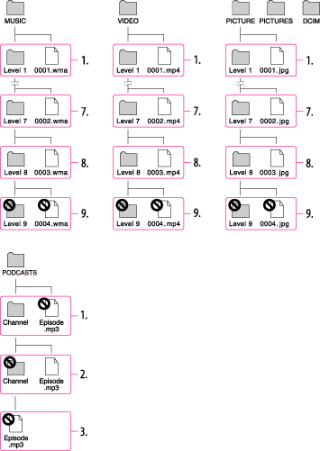 Der „WALKMAN“ kann Songs/Videos/Fotos auf der 1. bis 8. Ebene eines Ordners und Podcast-Episoden auf der 2. Ebene des Ordners [PODCASTS] wiedergeben.
