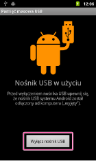 Jeśli nie jest on wyświetlany na ekranie, przeciągnij pasek statusu, a następnie dotknij opcji [Wyłącz nośnik USB] na panelu powiadomień.