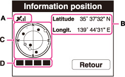 La position du satellite peut être vérifiée sur l’affichage d’informations de position (C). L’état d’acquisition d’informations du satellite est affiché sur l’indicateur de triangulation (D). L’indicateur de triangulation devient vert lorsque la triangulation s’est terminée avec succès.