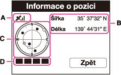 Polohu družice lze ověřit při zobrazení informací o poloze (C). Stav příjmu informací z družice se zobrazí na indikátoru triangulace (D). Když je triangulace úspěšně dokončena, indikátor triangulace zezelená.