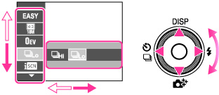 (Безперерв. Зйомка/Автоспуск).Щоб відкрити екран налаштування певної функції, натискайте на диск керування у напрямку до потрібної піктограми.