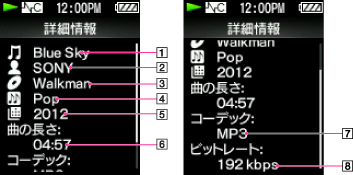 曲の再生時間、音楽ファイル形式、ビットレート、ファイル名などが表示されます【詳細】。