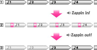 Toistettavien kappaleleikkeiden toistoaika on joko [ZAPPIN Short] tai [ZAPPIN Long].