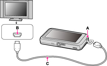 Raccordez le connecteur HDMI de l’appareil (A) et la prise HDMI (B) à l’aide d’un câble HDMI (vendu séparément) (C).