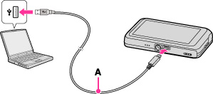 Liitä kamera tietokoneeseen käyttämällä toimitettua USB-mikrokaapelia (DSC-WX70) / USB-monikäyttöliitäntäkaapelia (DSC-TX66) (A).
