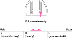 Firmowo na słuchawki nałożone są wkładki w rozmiarze M. Jeśli nie pasują one do ucha, wymień je na wkładki w rozmiarze S lub L (wchodzi w skład zestawu). Rozmiar wkładek można określić na podstawie koloru w środku.