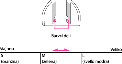 V tovarni se v slušalke vstavijo ušesni čepki velikosti M. Če menite, da vam ušesni čepki velikosti M ne ustrezajo, jih zamenjajte z ušesnimi čepki velikosti S ali L (priloženo). Velikost ušesnih čepkov ugotovite po barvi njihove notranjosti.