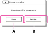 A: Als u [Delen] selecteert, kunt u de hoogtepuntfilm naar internet uploaden met de ingebouwde "PlayMemories Home" software of DVD's maken met de "DVDirect Express" DVD-writer. [Details][Details]