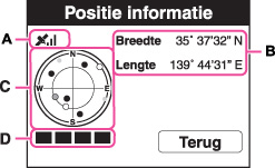 De positie van de satelliet kan worden gecontroleerd op het positie-informatiescherm (C). De status van het verkrijgen van de satellietinformatie wordt afgebeeld op de driehoeksmeting-indicator (D). De driehoeksmeting-indicator wordt groen zodra de driehoeksmeting met succes is voltooid.