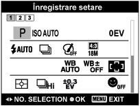 (Mod reapelare memorie) după ce finalizaţi setările de fotografiere, setările înregistrate au prioritate şi setările iniţiale pot fi anulate. Verificaţi indicatoarele de pe ecran înainte de a fotografia.