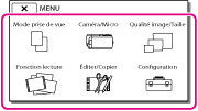 Les menus [Caméra/Micro] et [Configuration] ont des sous-catégories. Sélectionnez l’icône de sous-catégorie de sorte que l’écran LCD affiche la liste des menus dans la sous-catégorie sélectionnée.