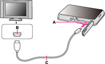 本機のHDMI端子(A)とテレビのHDMI端子(B)をHDMIケーブル(別売)(C)で接続する