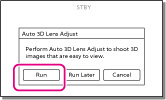Ak vyberiete položku [Run Later], pri najbližšom zapnutí kamkordéra sa zobrazí obrazovka [Auto 3D Lens Adjust].
