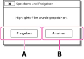 A: Mit der Auswahl [Freigeben] können Sie den Highlights-Film mit der integrierten Software „PlayMemories Home“ [Details] in das Internet hochladen oder DVDs mit dem „DVDirect Express“ DVD-Brenner erstellen. [Details]