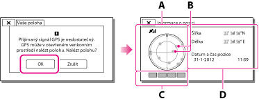 Pokud videokamera není schopna zjistit aktuální polohu, zobrazí se informace o zaměřování.
