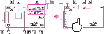 زر الزوم (W: زاوية عريضة/T: صورة مقربة)، زرSTART/STOP (في وضع تسجيل صور متحركة)، زرPHOTO (في وضع تسجيل صور ثابتة)