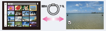 หมุนก้าน W/T (ซูม) ไปทางด้าน T () ในโหมดดัชนีเพื่อย้อนกลับสู่โหมดแสดงภาพเดี่ยว และหมุนก้านไปทางด้าน W () ในโหมดแสดงภาพเดี่ยวเพื่อกลับสู่โหมดดัชนี