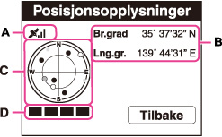 Satellittens posisjon kan kontrolleres på posisjonsinformasjonsvisningen (C). Hentestatus for satellittinformasjonen vises på trianguleringsindikatoren (D). Trianguleringsindikatoren blir grønn når trianguleringen er fullført.