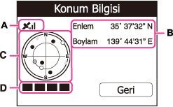 Uydunun konumu, konum bilgisi görünümünde kontrol edilebilir (C). Uydu bilgisi alma durumu nirengi göstergesinde görüntülenir (D). Üçgenleme başarıyla tamamlanınca nirengi göstergesi yeşile döner.