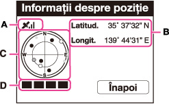 Poziţia satelitului poate fi verificată pe ecranul cu informaţii despre poziţie (C). Starea obţinerii informaţiilor despre sateliţi este afişată pe indicatorul de triangulaţie (D). Indicatorul de triangulaţie devine verde atunci când triangulaţia este finalizată cu succes.