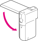 Fermez l'écran LCD, puis faites glisser et ouvrez le couvercle de la batterie/carte mémoire/prise tout en faisant glisser et en maintenant la manette de verrouillage du couvercle.