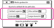 Puede cambiar el modo de grabación para seleccionar la calidad de película al grabar películas con calidad de imagen de alta definición (HD). El tiempo de grabación del soporte de grabación cambia dependiendo del modo de grabación.