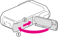 Luk LCD-skærmen, skub derefter dækslet til batteriet/hukommelseskortet/stikket ned og åbn det, mens du skubber låseknappen til dækslet og fastholder den.