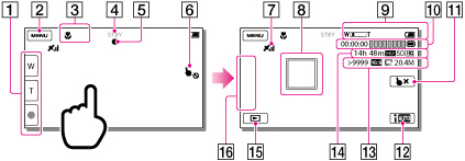Кнопка трансфокатора (W: ширококутна зйомка/T: довгофокусна зйомка), кнопка START/STOP (у режимі записування відео), кнопка PHOTO (у режимі фотографування)