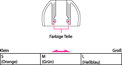 Werkseitig sind Ohrpolster der Größe M an den Kopfhörern angebracht. Wenn die Ohrpolster der Größe M (mittel) Ihnen nicht passen, tauschen Sie sie gegen die Ohrpolster (mitgeliefert) der Größe S (klein) oder L (groß) aus. Die Größe der Ohrpolster erkennen Sie an der Farbe im Inneren.