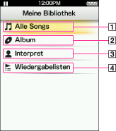 Sie können bestimmte Songs wiedergeben, indem Sie sie in [Alle Songs], [Album], [Interpret] oder [Wiedergabelisten] auswählen. Sie können mit der Suchfunktion auch nach einem gewünschten Song suchen.