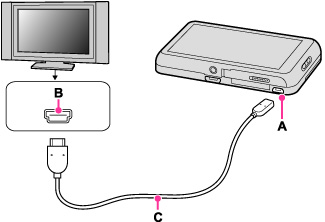 本機のHDMI端子(A)とテレビのHDMI端子(B)をHDMIケーブル(別売)(C)で接続する